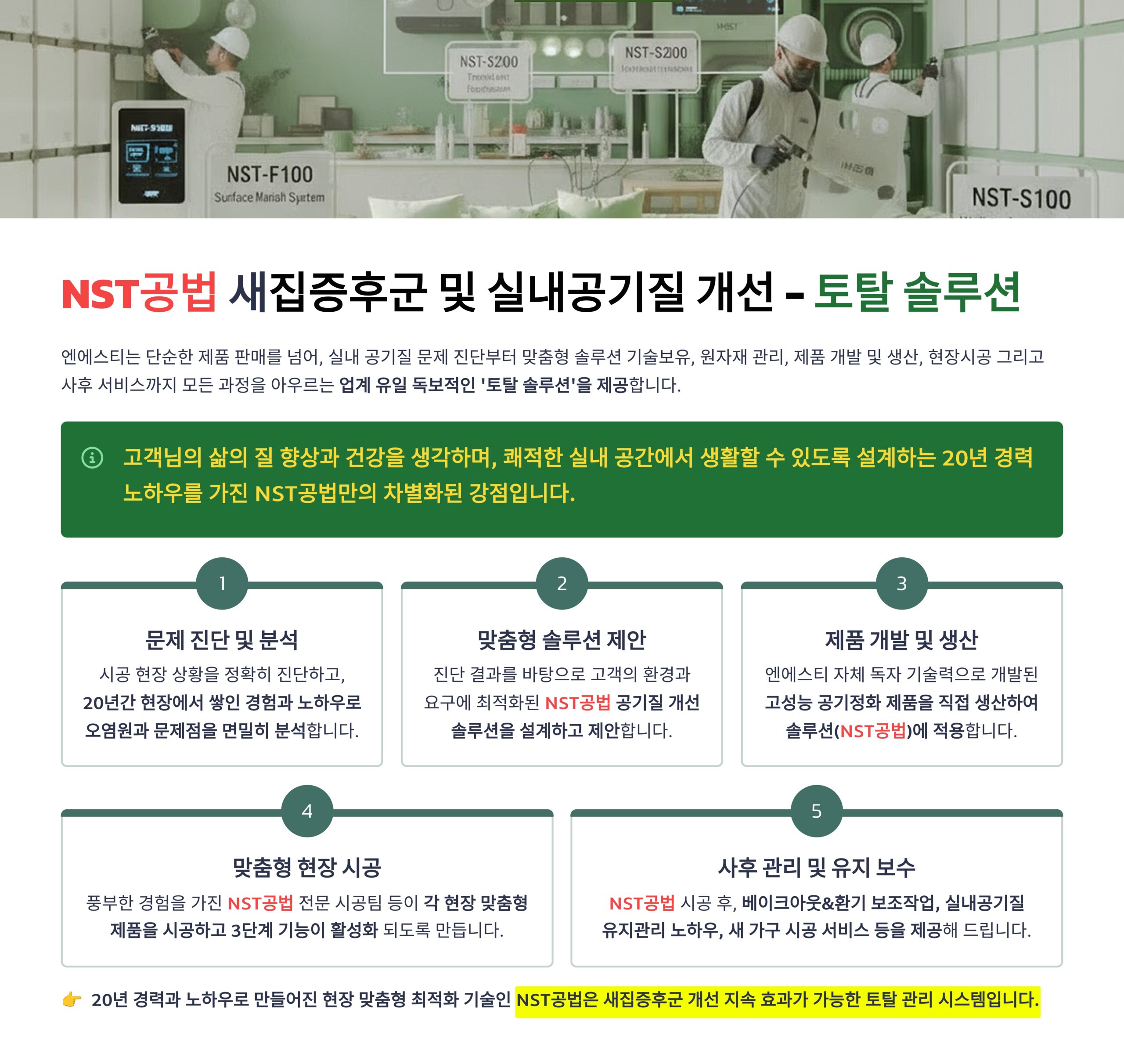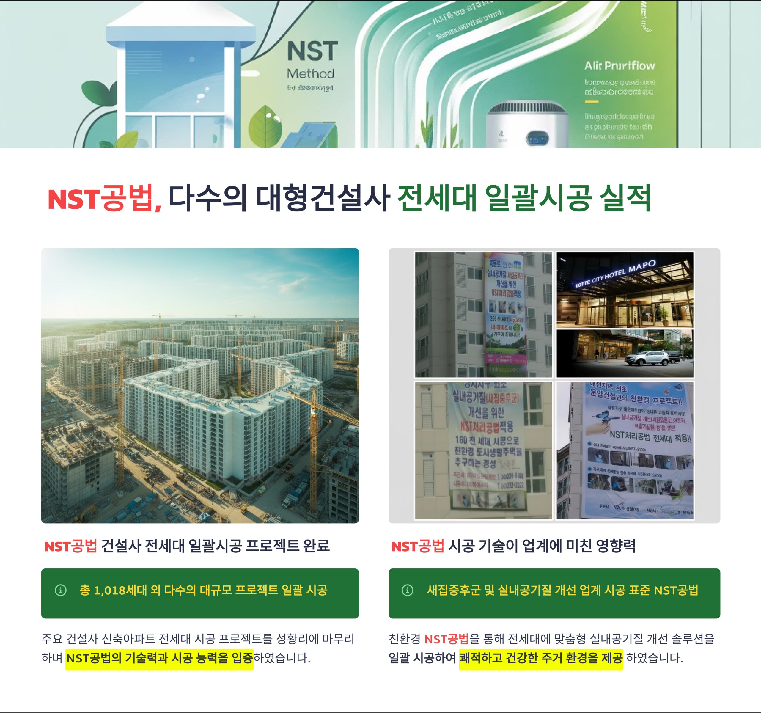 NST공법 공식홈페이지 | 새집증후군 개선 시공 전문 기술 우리가족! 우리아이! 건강 지킴이 (주)엔에스티 ★★2025 전국 신규사업자 모집中 (많은 관심 바랍니다.) (주)엔에스티 블로그 (주)엔에스티의 새집증후군 예방 시공 새집증후군의 원인을 근본적으로 해결하고 가족의 '깨끗한 숨'을 책임지는 친환경 기술입니다. NST공법은 휘발성유기화합물(VOCs), 포름알데하이드 등 실내공간에서 보이지 않는 유해물질을 [차단&분해&흡착] 제거 해주고 고객님의 소중한 공간을 보호합니다. (주)엔에스티 기술력이 어떻게 실내공간을 변화시키고 우리가족 일상에 스며드는지 영상을 통해 확인하실 수 있습니다. 새집증후군 개선 업계 현장 시공 표준 20년의 노하우로 최적화 된 NST공법은 고객님의 실내공간을 과학적으로 설계합니다. 20년간 발전해 온 현장 '맞춤형 기술' 입니다. 20년의 노하우로 완성된 ‘3단계 현장 맞춤형’ 친환경 새집증후군 개선 시공 기술입니다.유해화학물질을 원천적으로 차단하고 지속제거하며, 주거공간의 실내공기질을 과학적으로 설계합니다. 신축 아파트 전세대 일괄시공으로 '검증된 기술'입니다. [현장진단] → [1단계 : 흡착·분해(NST-S100)] → [2단계 : 차단(NST-S200)] → [3단계 : 흡착·탈취(NST-F100)] 시공※시공 후에는 생활 온도에서 2~3일간 ‘자연환기(Bake-out)’를 권장하여 시공 효율 극대화 공인기관 및 정부 시스템이 검증한 '안전한 기술'입니다. 인체에 무해한 친환경 기술로 시공과정을 *현장에 오셔서 확인할 수 있습니다. 현장 방문이 어려운 경우, 실시간 문자 또는 카카오톡으로 시공 진행 상황을 안내해 드립니다. ※특허 및 증명서 등 관련 자료는 ▶기술현황(클릭) 에서 확인하실수 있습니다. 업계 원조 기술은 다릅니다. NST공법은 국내 유일의 새집증후군 개선 '통합 솔루션'으로고객님의 실내공간의 공기질을 설계하고 유해물질을 원천 제거합니다. Diagnosis [현장진단] NST-S100 [분해(제거)/흡착] 클릭하시면 상세설명을 보실 수 있습니다 NST-S200 [침투/차단(제거)] 클릭하시면 상세설명을 보실 수 있습니다 NST-F100 [흡착/탈취(제거)] 클릭하시면 상세설명을 보실 수 있습니다 (주)엔에스티의 NST공법 시공 실적과 전국 네트워크 누적 시공량 0 건+ 전국 지점 1 개+ 업력 0 년 OUR GALLERY (주)엔에스티에 대해서 더 알아보세요 OUR Difference (주)엔에스티 차별화 자체생산 제품 연구부터 생산, 판매까지 원-스탑(One-Stop) 안전성 확보 생활화학제품 안전성 합격, 환경부 신고 완료 성능검증 국내 대형건설사 직접 시공(전세대) 다수 실적 Contact NST 새집증후군 예방! 더 이상 고민하지 마세요. (주)엔에스티가 있습니다. 문의하기