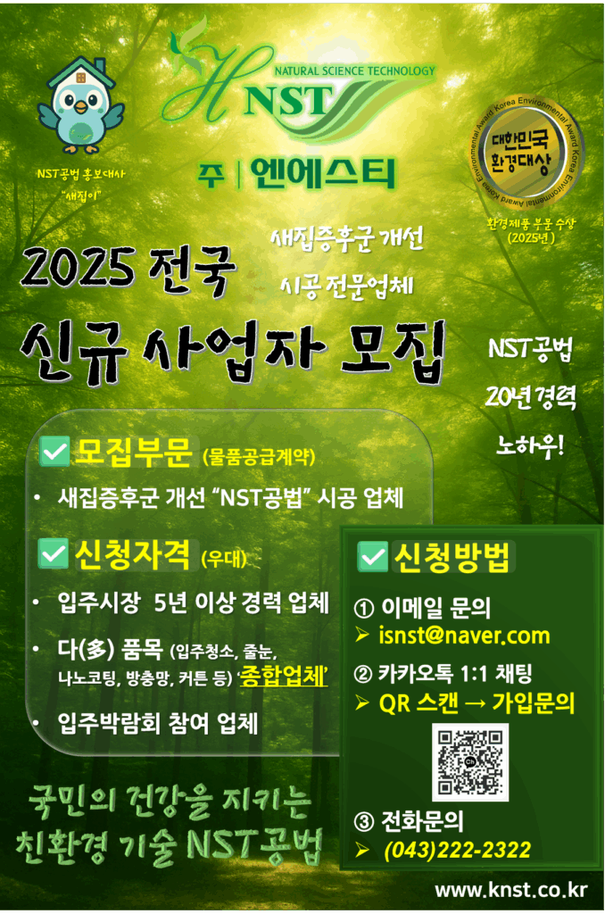 NST News 언론동향 홈 · 언론동향 News (주)엔에스티 ˙ 새집증후군 ˙ 실내공기질 ˙ 환경 등 관련 기사를 확인해 보세요 엔에스티, 전국 신규사업자 모집 본격화… NST공법 홍보대사 ‘새지비’ 런칭 2025-09-16 (주)엔에스티, ‘2025 대한민국환경대상’ 환경제품 부문 본상 수상 2025-07-21 서울시, ‘새집 증후군 줄인다’… 100세대 이상 공동주택 실내 공기질 관리 강화 2025-05-08 왜? 새집증후군 예방을 위해서 NST공법 시공이 필요하다고 하는 것일까요? 새집증후군 해결사, NST 공법 확인해보기(터치)